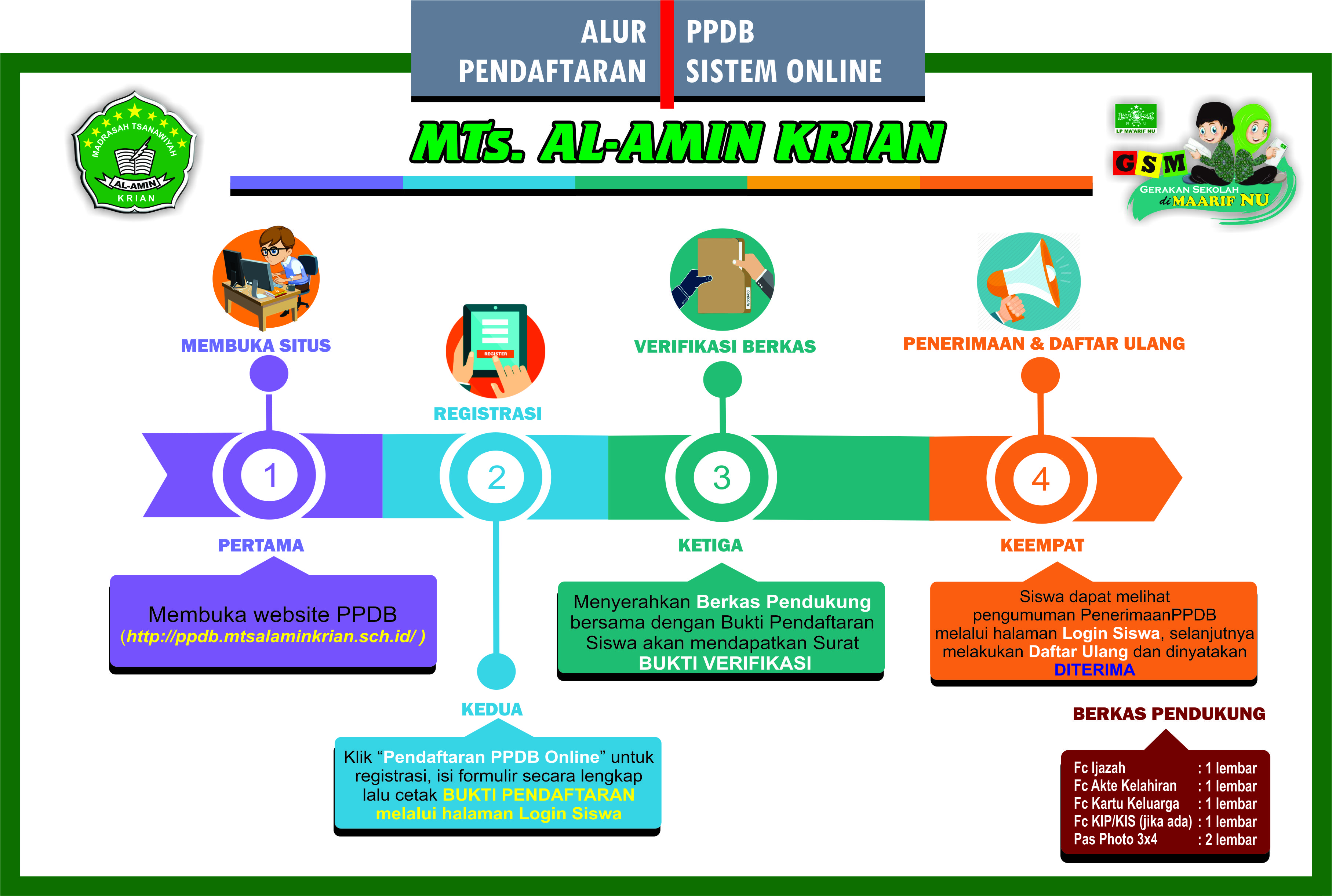 MTs. AL-AMIN KRIAN menyediakan PPDB secara online diharapkan proses PPDB dapat berjalan cepat dan bisa dilakukan dimanapun dan kapanpun selama sesi PPDB Online dibuka, Guna untuk mempermudah Pendaftaran calon siswa baru bisa mengakses website PPDB Online. Proses pendaftaran calon siswa baru juga bisa dilakukan menggunakan formulir konvensional (offline) dengan langsung datang ke kantor / Panitia PPDB MTs. AL-AMIN KRIAN.